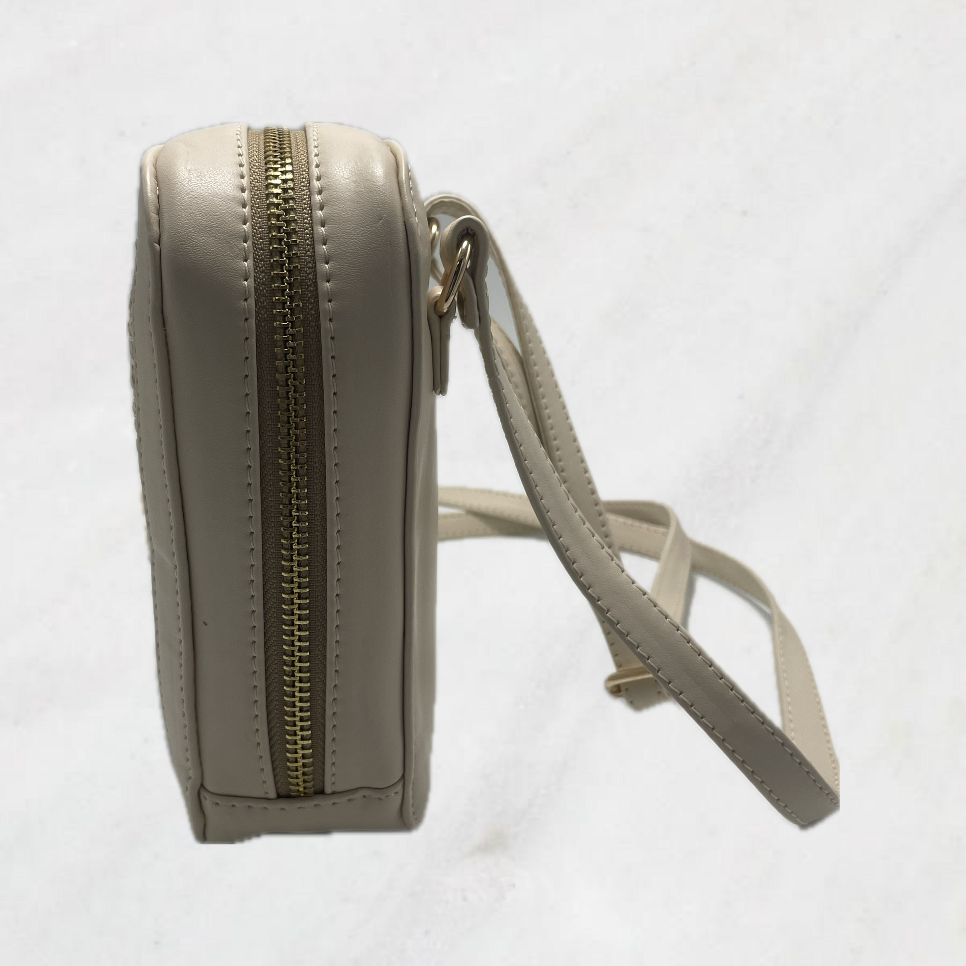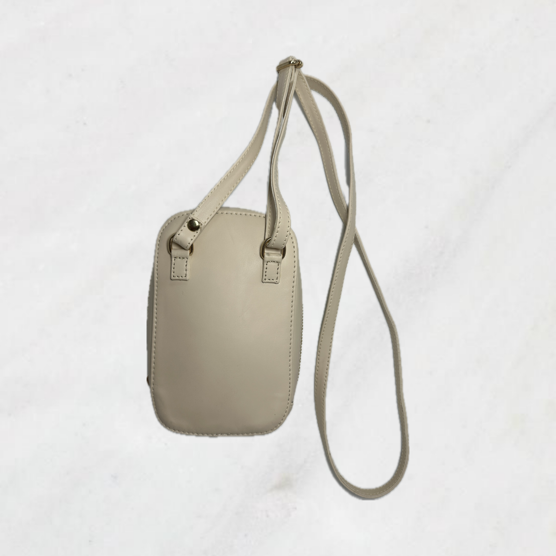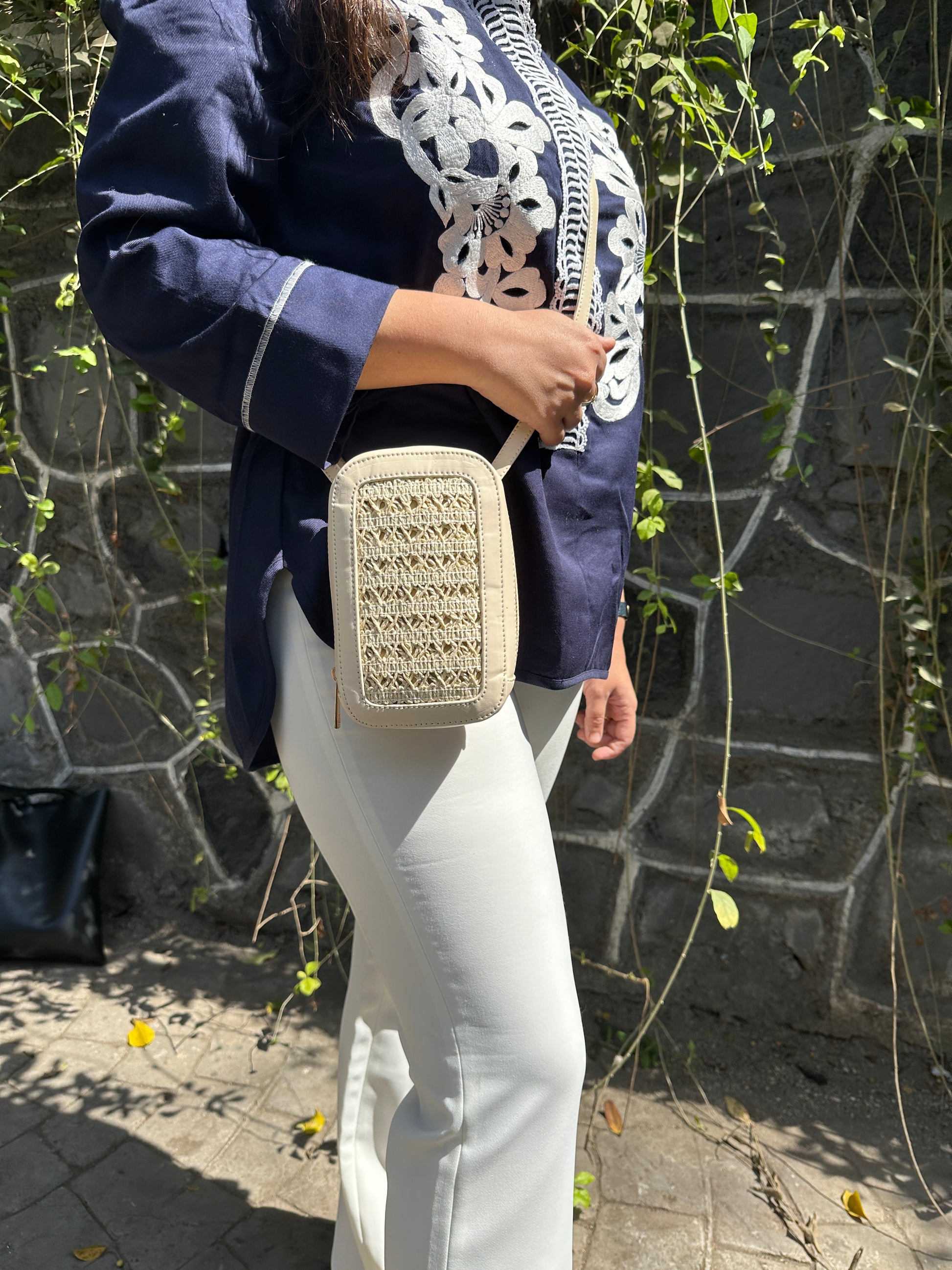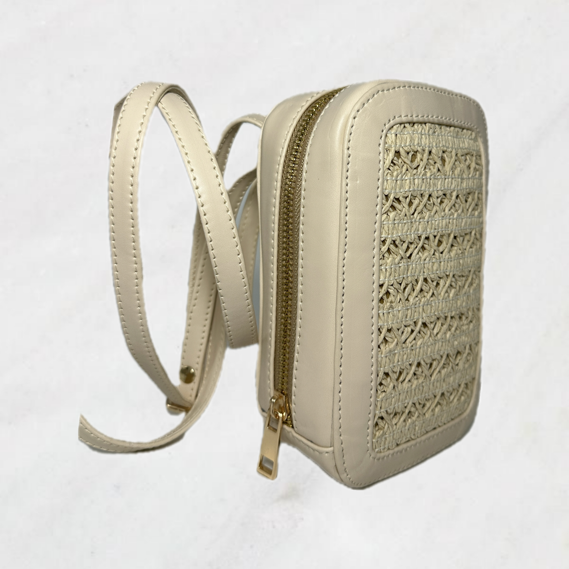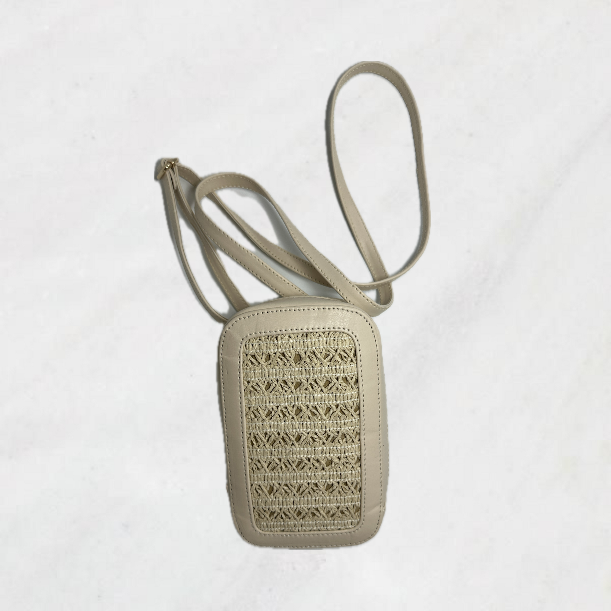 Sleek and Sophisticated design made of vegan leather. This mobile sing boasts a mat beige finish with elegant raffia patch detailing . Making it perfect accessory for any outfit.