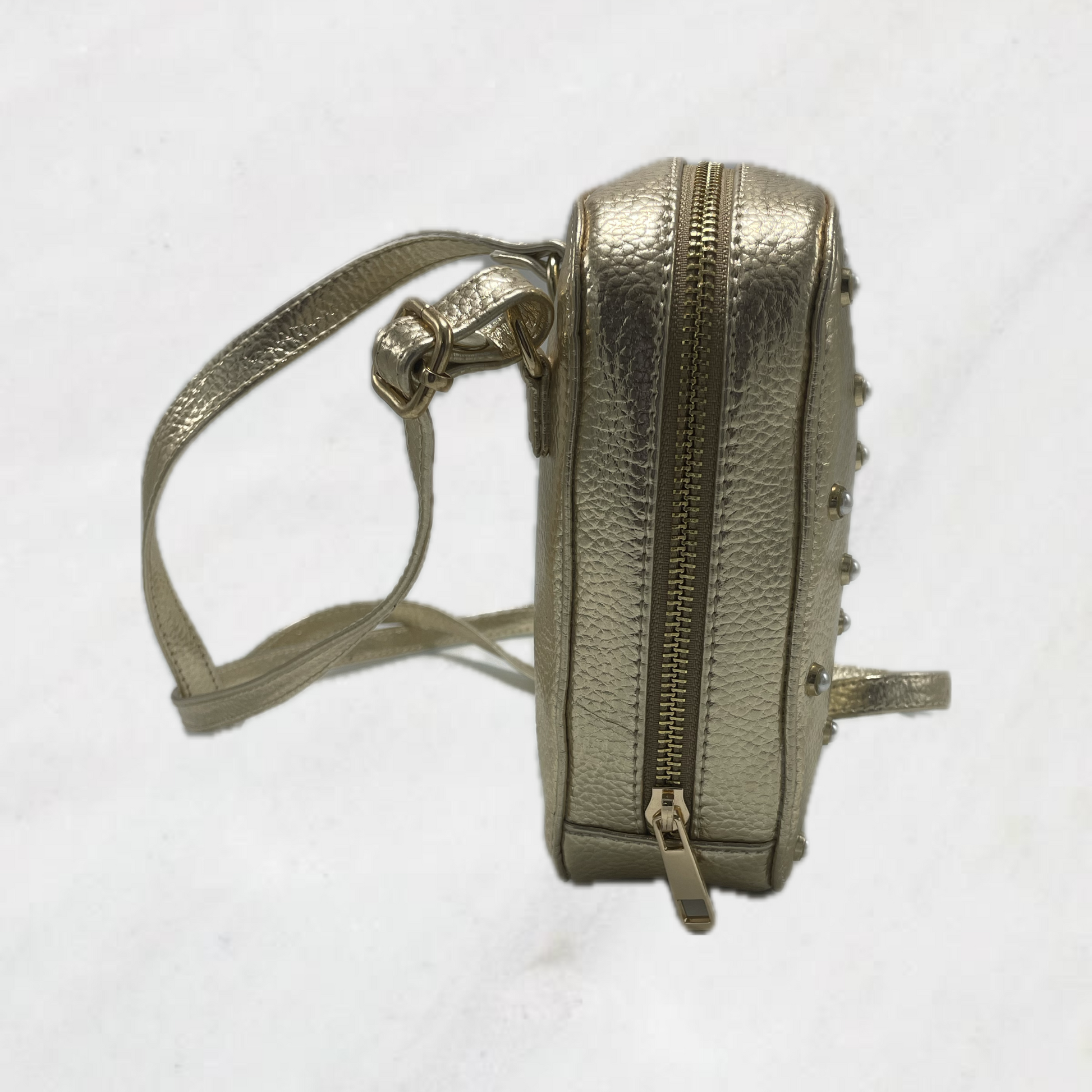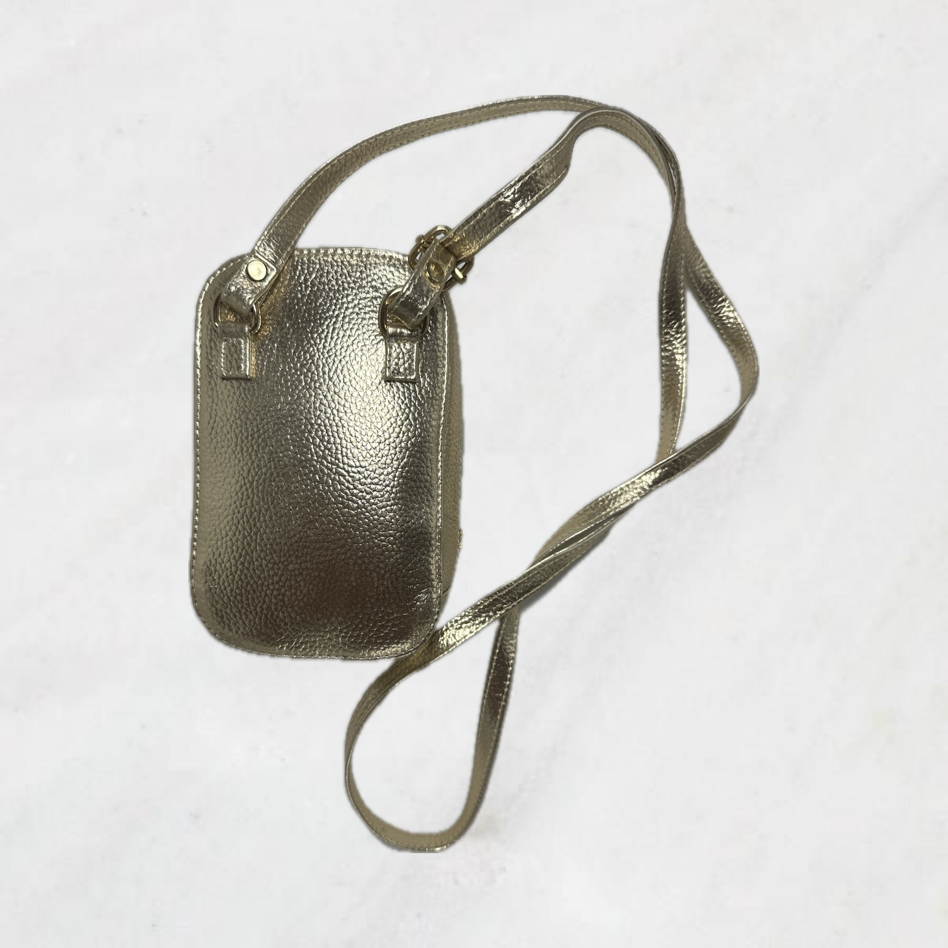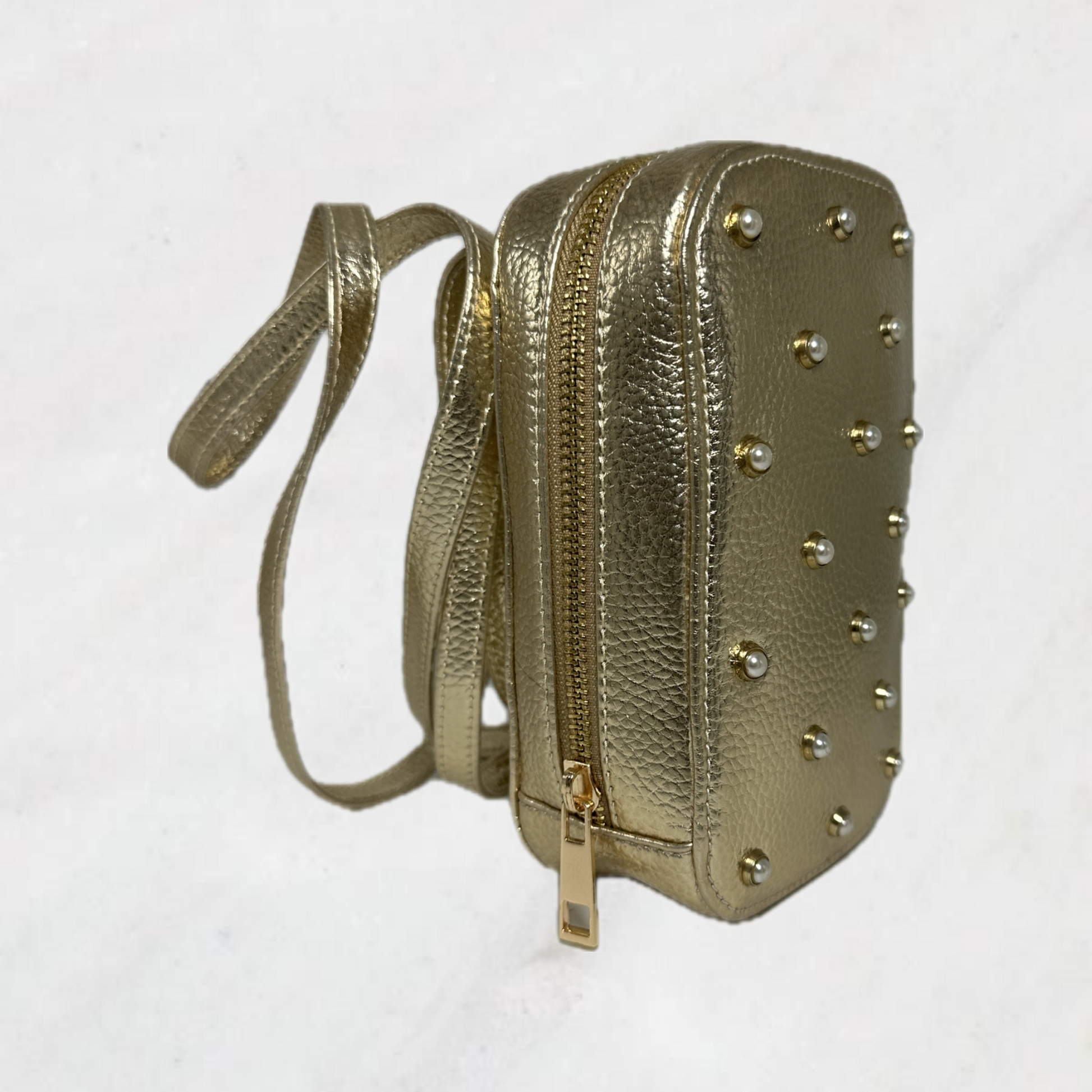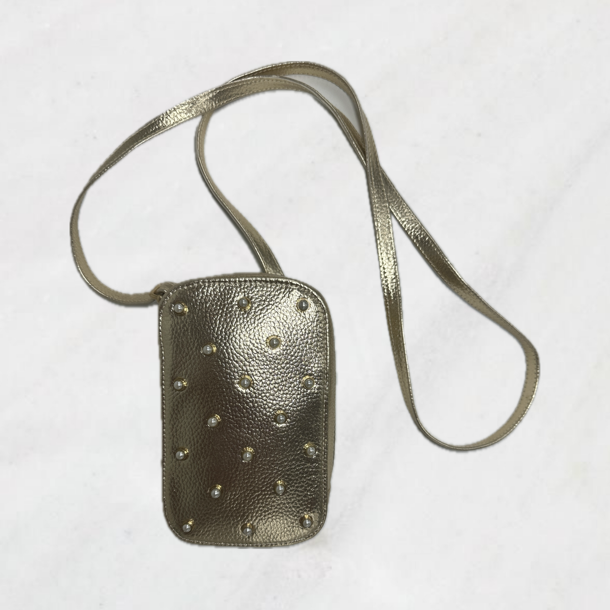 Sleek and Sophisticated design made of vegan leather. This mobile sing boasts a mat gold finish with elegant pearl stud detailing . Making it perfect accessory for any outfit.